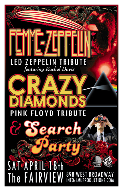 . Saturday, April 18th IMU presents FEMME ZEPPELIN Led Zeppelin Tribute featuring Rachel Davis, CRAZY DIAMONDS Pink Floyd Tribute & SEARCH PARTY @ The Fairview, 898 West Broadway . Show 9:30pm / $10 cover