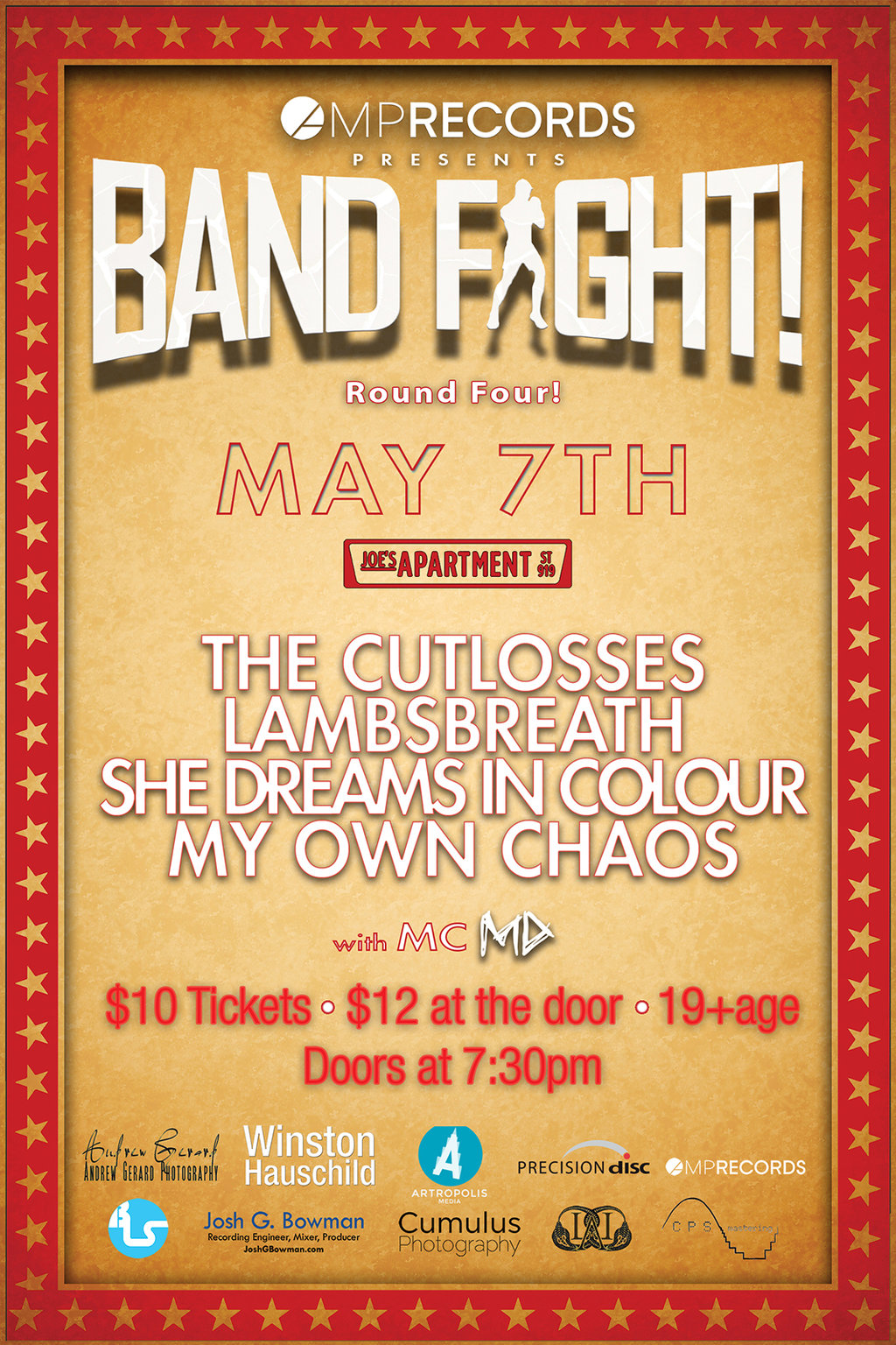 Band Fight will feature 16 local bands duking it out for a grand prize of a songwriting session with a professional songwriter, one professionally recorded song with Winston Hauschild, Mastering by CPS mastering a photo shoot with Andrew Gerard Photography, artwork design from Artropolis Media, 1,000 CDs from Precision Disc, and Radio Promotion and a Publicity Campaign from AMP Records. Totaling over $20,000 worth of prizes for the winner… Not to mention bragging rights of being crowned as Band Fights “KING OF THE RING”.