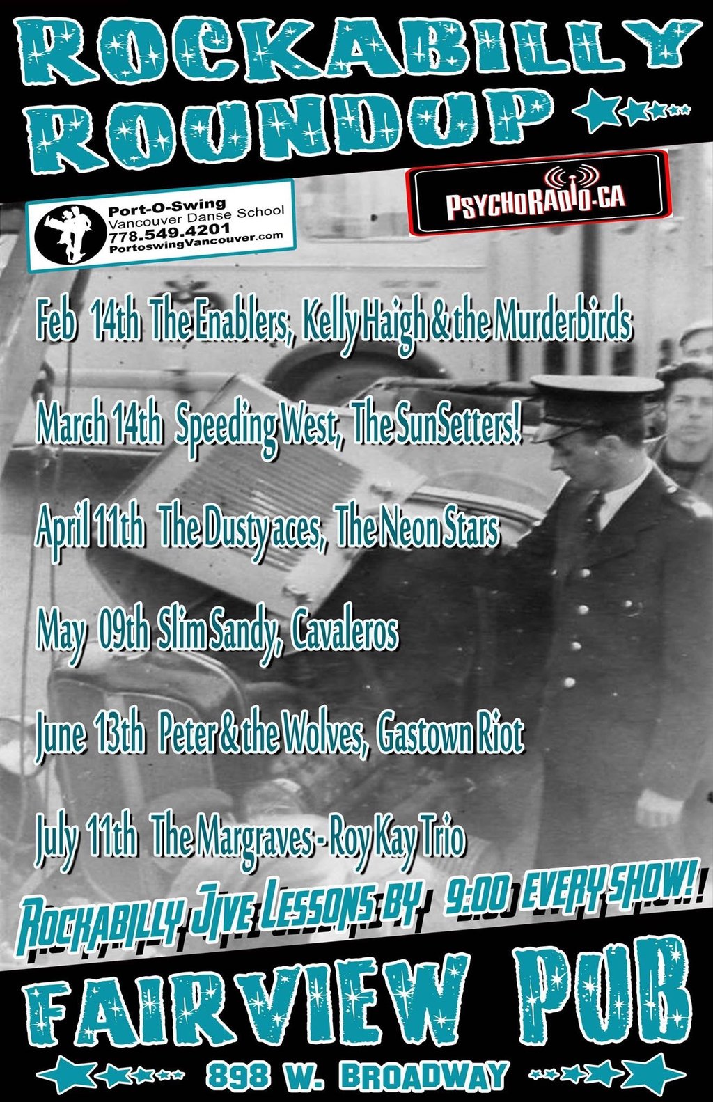 Coincidentally, both of the featured bands at this month's Rockabilly Roundup are making the trek from the island to entertain all you fine folks at The Fairview. If you want to know what it's like to take a ferry to get to the Fairview, take a bus through the Downtown Eastside while having a smoke on the roof of the bus and throwing food scraps at crackheads.