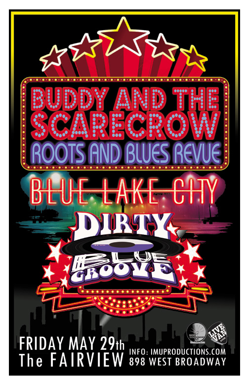 . Friday, May 29th IMU presents BUDDY AND THE SCARECROW Roots & Blues Revue, BLUE LAKE CITY & DIRTY BLUE GROOVE @ The Fairview, 898 West Broadway . Show 9:30pm / $10 cover