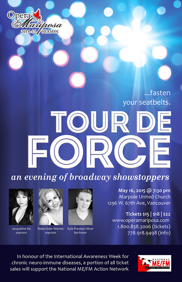 Opera Mariposa’s multi-award-winning performers present a night of Broadway showstoppers for a great cause! Enjoy hit songs from Wicked, Spamalot, Sweeney Todd and many more, all in support of Chronic Neuro-Immune Disease Awareness Week and the National ME/FM Action Network. You won’t want to miss this unforgettable charity benefit from the company whose performances have been hailed as "an evening of delight" (Review Vancouver), "an extraordinary feat" (North Shore News) and "a stroke of genius" (The Voice). The evening will include a charity prize raffle, and a reception for those who wish to stay.