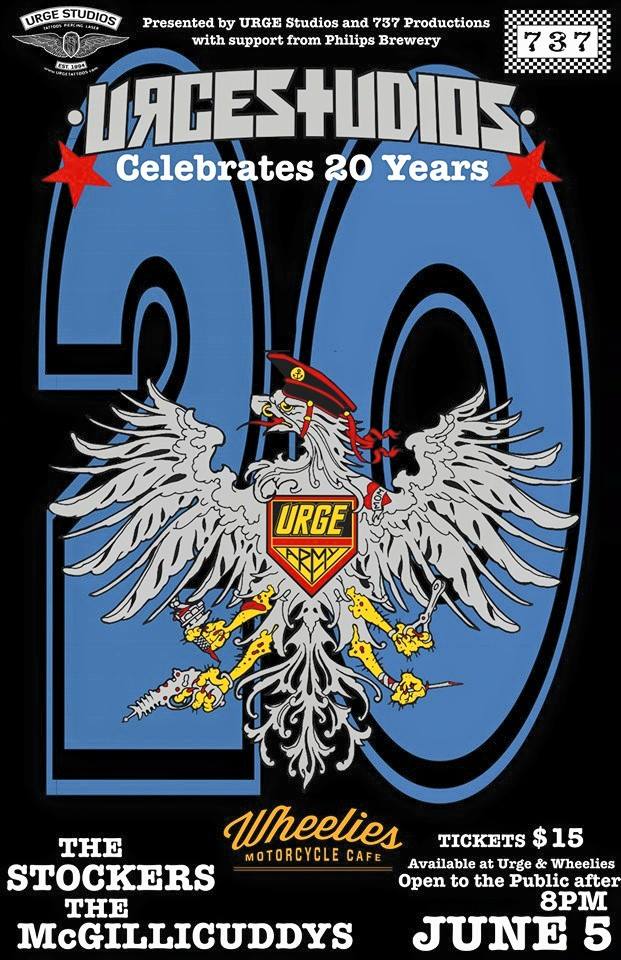 Urge Studios Celebrates 20 Years: The McGillicuddys, The Stockers @ Wheelies Motorcyles Jun 5 2015 - Feb 17th @ Wheelies Motorcyles