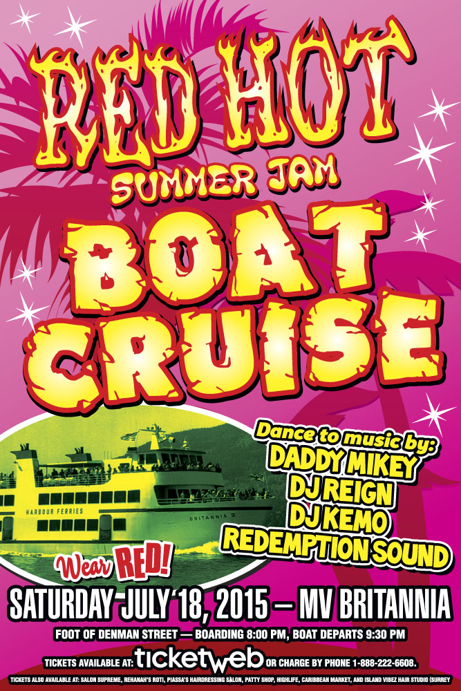 Enjoy Caribbean / Latin vibes on the open seas on a Tropical Boat Cruise; featuring dance music by Daddy Mikey, DJ Reign, DJ Kemo and Redemption Sound and don’t forget to dress tropical for this Red Hot Summer Jam Tropical Boat Cruise, wear something red! This annual Boat Cruise brought to you by Melo Productions, promises to be HOT! HOT! HOT!