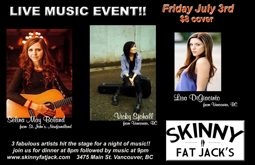 Selina is on tour all the way from Newfoundland and she is sharing the stage with Vancouver locals Lisa and Vicky to present a fabulous night of live music in the heart of Main Street Vancouver. This will be a treat!