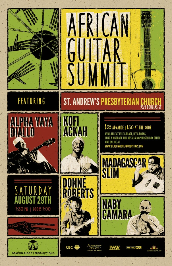 This Juno Award winning group features, from Guinea, the smooth fire of Alpha YaYa Diallo and the master balafon player Naby Kamara; from Ghana the heartbeat of drummer Kofi Ackah, from Madagascar the thoughtful composer, powerful vocalist and sublime guitar player Donné Roberts and the blues guitar master Madagascar Slim. A truly incredible experience you won't want to miss!