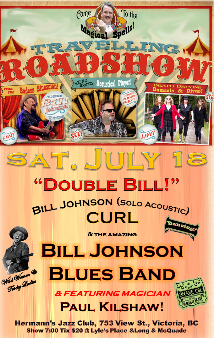 Magic Man Paul Kilshaw will dazzle patrons with an amazing assortment of spells before daring double bluesman Bill Johnson single-handedly navigates a high-wire acoustic guitar! Then the daunting damsels of CURL (featuring new drummer Shakin' Sherry Clayton, Diva Dee on piano, Sultry Sue on bass and Howlin' Helen on vocals) will rattle the big top with moonshine blues and soul. The evening ends with Bill Johnson's ferocious blues band growling and howling into the night! Tix $20 @ Lyle's/Long & McQuade