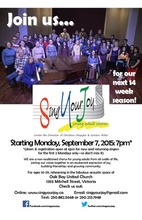Victoria's incredibly fun young adult community chorus is welcoming new singers for its Fall Season. SingYourJoy is a non-auditioned group for young adults from all walks of life. We sing together and build a new community of friends. We have some great performance opportunities this season and we always give something back to the community.