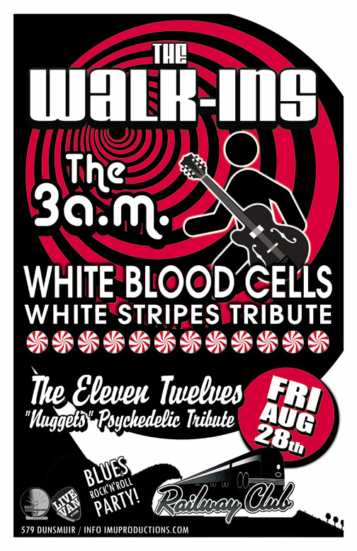 . Friday, August 28th IMU presents The WALK-INS, WHITE BLOOD CELLS White Stripes Tribute, The ELEVEN TWELVES & The 3 a.m. @ The Railway Club, 579 Dunsmuir . Show 9:30pm / $10 cover