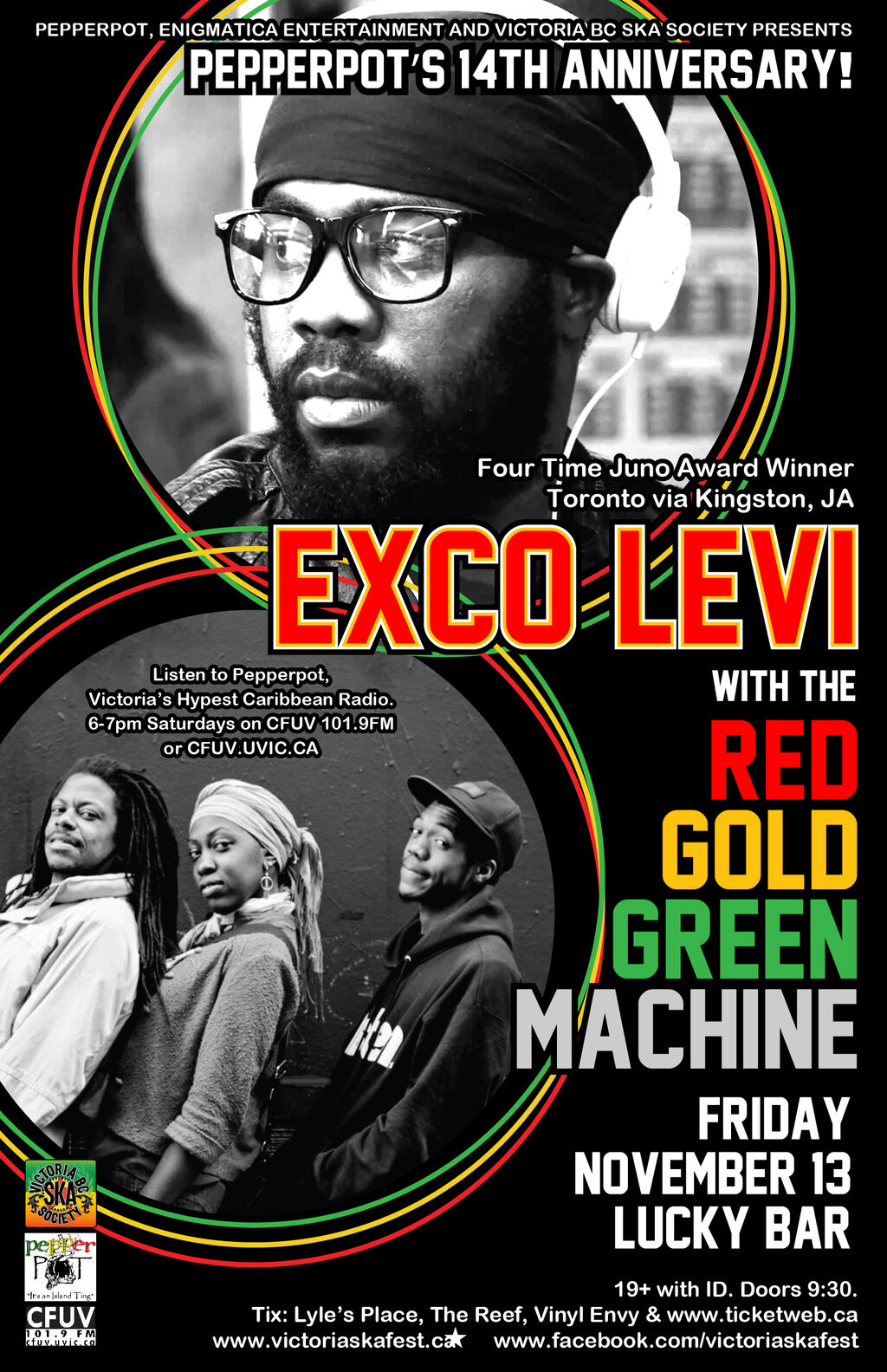 On Friday, November 13th, Pepperpot, Enigmatica Entertainment & Victoria BC Ska Society are proud to present Pepperpot's 14th Anniversary Bash featuring Canada's top conscious dancehall/reggae performer EXCO LEVI! Exco Levi will be joined by The Red, Gold and Green Machine - power trio hailing from Los Angeles and Vancouver & one of the freshest dancehall/reggae selector's on Canada's westcoast - Tank Gyal.