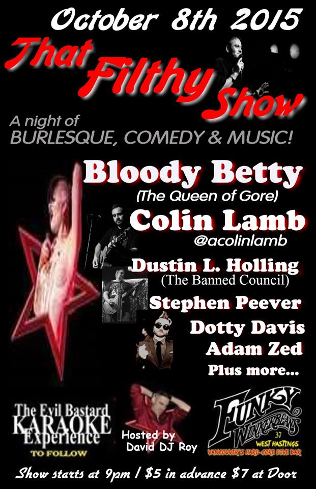 THURS OCT 8 * THAT FILTHY SHOW * COMEDY * MUSIC * BURLESQUE * FREAKS * BLOODY BETTY * COLIN LAMB * DUSTIN L. HOLLING * STEPHEN PEEVER * DOTTY DAVIS * ADAM ZED * HOSTED BY DAVID DJ ROY * ...$7