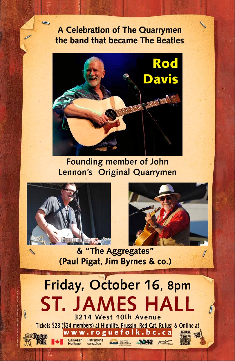 Rod Davis, founding member of The Quarrymen with John Lennon, brings the music of the Beatles to Vancouver with the help of The Aggregates: Jim Byrnes, Paul Pigat, Keith Picot and Jesse Cahill.