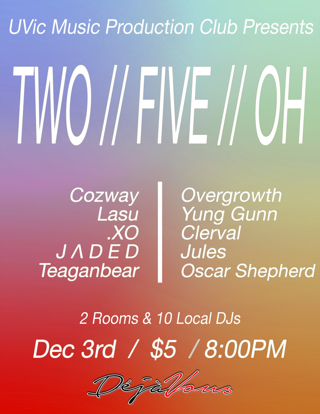 UVic Music Production Club presents its very first show! Showcasing 2 stages with 5 artists on each, ranging from EDM to Soul to Hip Hop. Come celebrate the ending of term with the birth of a new community and amazing local artists.
