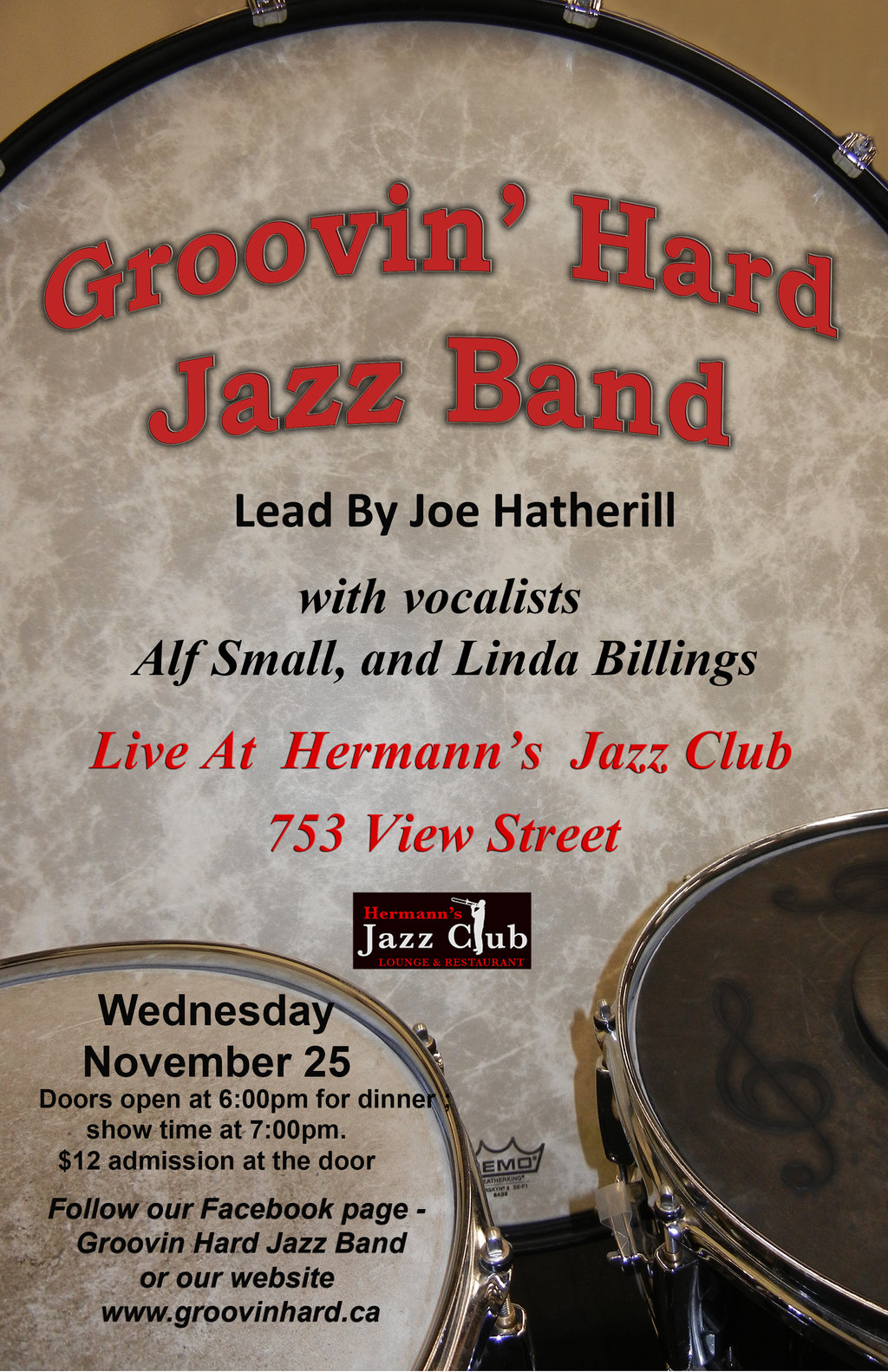 By popular request, 'Groovin Hard' returns to Hermann's on Wednesday, November 25. Playing a variety of big band and jazz arrangements, this energetic 16-piece band, joined by vocalists Alf Small and Linda Billings, will dazzle you with instrumentals and vocals from the 1940s onwards. Musical Director Joe Hatherill.