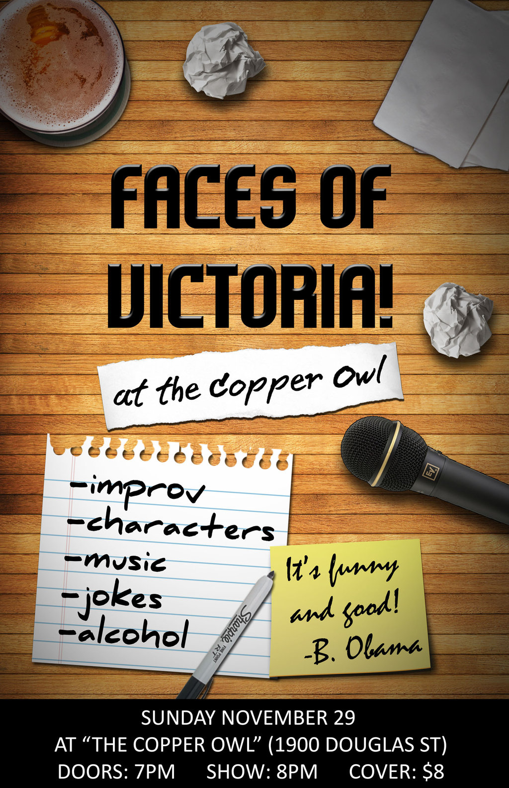 "Faces of Victoria" Improv Comedy showcase: Andrew Brimmel, Brooke Cameron, Daniel Belkin, Kevin  Koch, Michael Nadolny, Ryan Steele, Shahin Sanjari, Matt Cowlrick @ Copper Owl Nov 29 2015 - Feb 24th @ Copper Owl