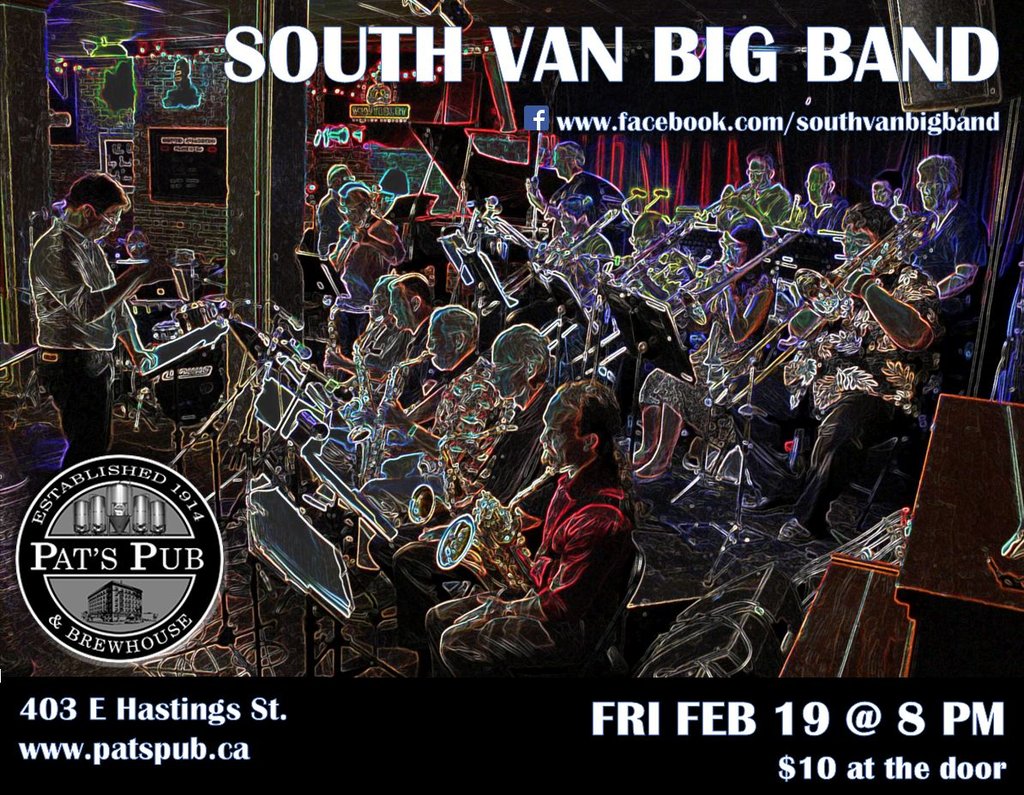 The big band is back with some new repertoire to jazz up a Friday night at Pat's Pub! Kick back with some great food and brews while the 17-piece South Van Big Band blows through a mish-mash of funk, swing, latin and contemporary jazz.