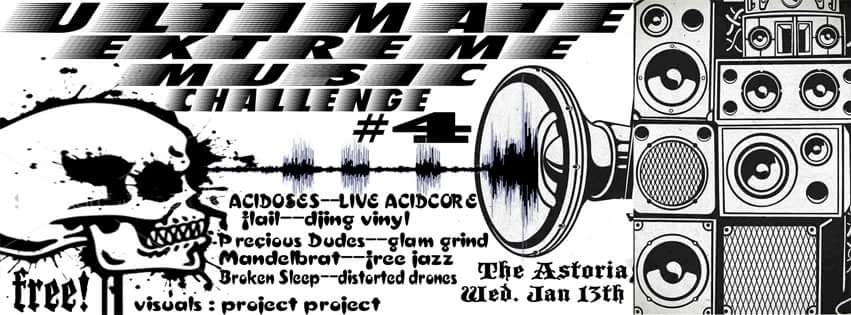 ULTIMATE EXTREME MUSIC CHALLENGE: Precious Dudes,  MANDELBRAT , Broken Sleep, ACIDOSES, FLAIL, Project Project  @ The Astoria  Jan 13 2016 - Feb 3rd @ The Astoria