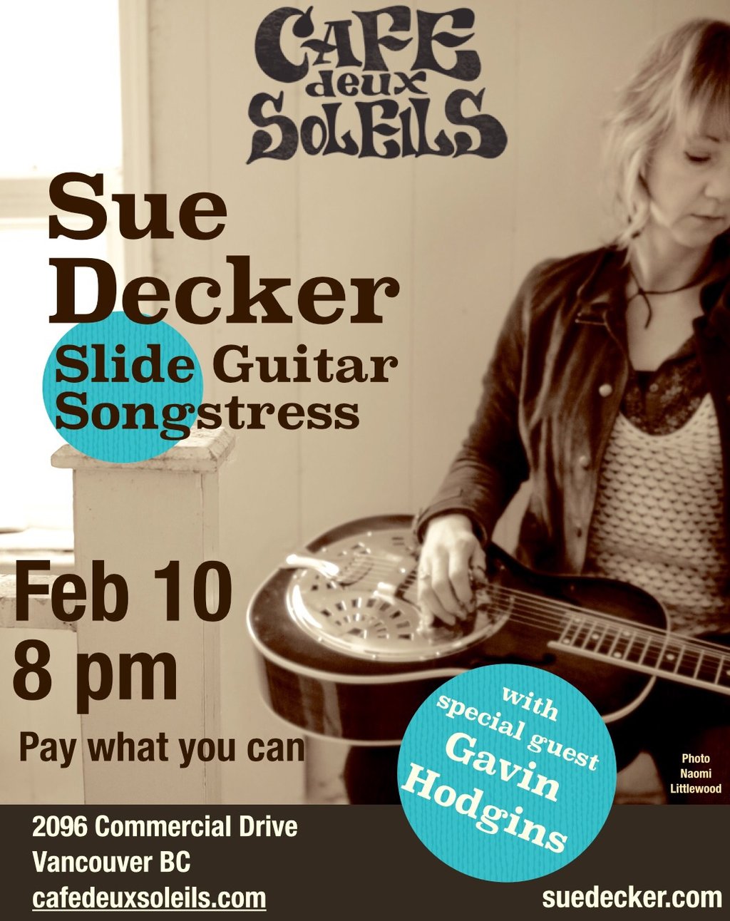 Slide Guitar Songstress: Sue Decker, Gavin Hodgins @ Cafe deux Soleils Feb 10 2016 - Feb 5th @ Cafe deux Soleils