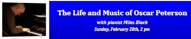 Pianist Miles Black will interpret the great Oscar Peterson, Canada’s most famous jazz musician, known for his hard swinging style and virtuoso technique. Miles has extensive experience in transcribing Oscar`s performances, and offers a wonderful afternoon of exciting music.