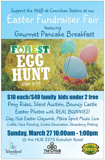 We invite you and your family to join us to support the HUB at our Easter Fundraiser Fair! The HUB is developing as a volunteer-driven community center for arts, cultural and recreational activities and is a fundraising vehicle sustaining the goals of Cowichan Station Area Association. Bring the family to EAT gourmet pancakes, HUNT for eggs in the Hub forest, DANCE to live music, BID on local ware at the silent auction, CUDDLE real bunnies at the photo booth, ENJOY fair attractions including PONY RIDES, BOUNCY CASTLE, FACE PAINTING, CRAFTS, COOKIE DECORATING, EASTER CLAYWORK, STRAWBERRY POTTING and lots more... We can't wait to see you there!