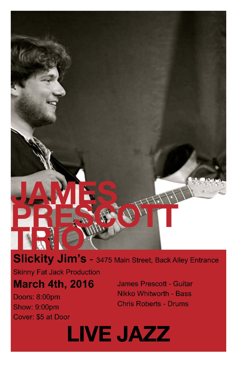Come out for an evening of high energy jazz music played by some of Vancouver's young up-and-coming jazz musicians. The James Prescott trio will be playing a mixture of originals, jazz standards, and songs not commonly associated with the jazz tradition. The trio features James Prescott on guitar, Nikko Whitworth on bass, and Chris Roberts on drums. The interplay and comradery between the band members creates an intimate feeling in the music that will transport any listener, so come out enjoy a beverage and listen to some amazing live music.