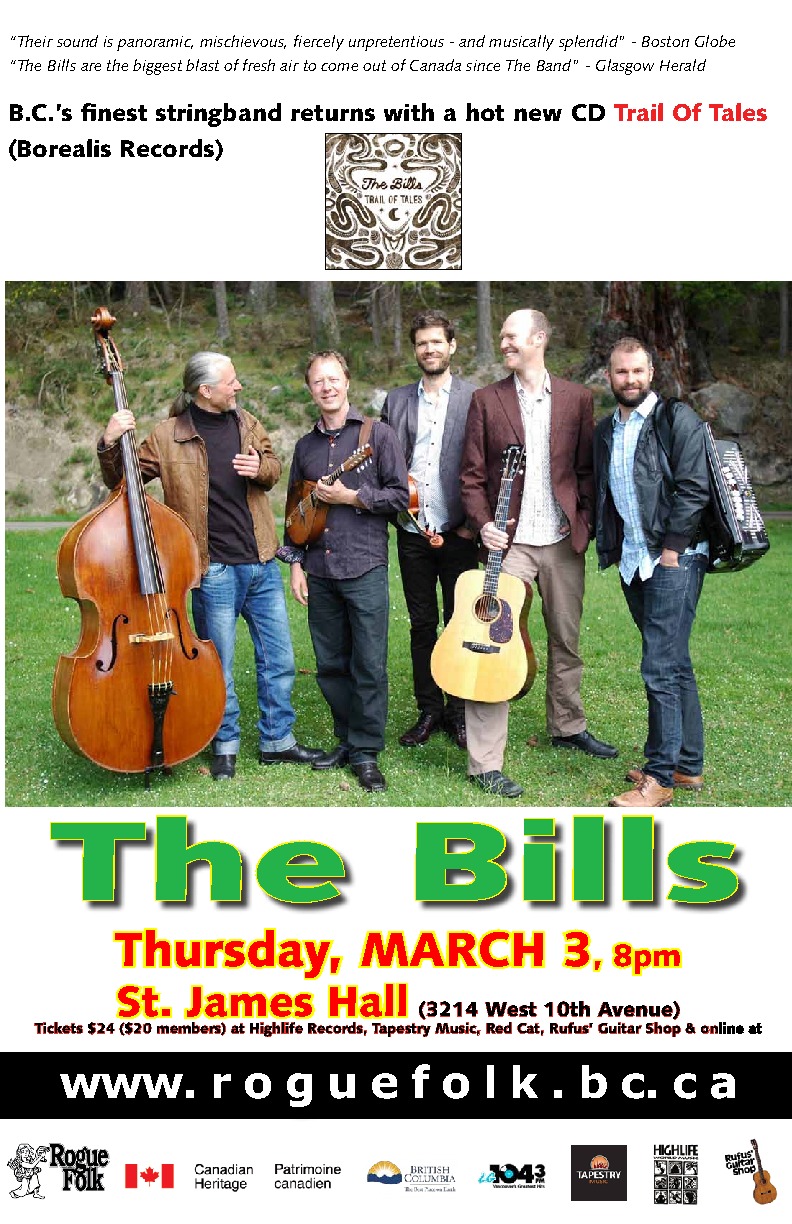 The Bills' brand new CD, Trail of Tales, features 14 new tracks and is officially released nationwide on March 4th. A wonderfully collaborative effort, the album has all five members of the band contributing compositional talents. With two previous JUNO nominations and multiple West Coast Music Awards under their belts, expect the musical magic you've come to love from this extraordinary quintet. They are renowned for their instrumental virtuosity, lush vocal arrangements, evocative songwriting, and a refreshing sound that transcends musical boundaries and defies simple categorization.