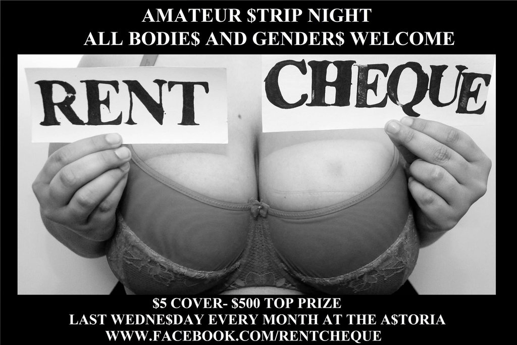 Again, Rent Cheque is a `pro-free` zone. Which means we are stripping for the common (and epically sexy) folks. That said, if you are an unstoppable peeler or other kind of bad-ass naked performer and wanna pimp your shit out at the end of our night once our voting is over- feel free to throw us a line at [email protected] . We probably wanna totally oogle you and help to promote your skills!