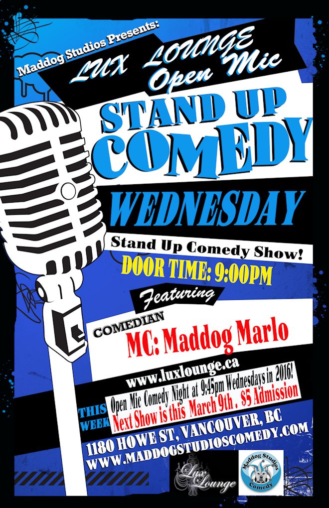 STAND UP COMEDY NIGHT THIS WEDNESDAY AT LUX LOUNGE - OPEN MIC SHOW - BY MADDOG STUDIOS!