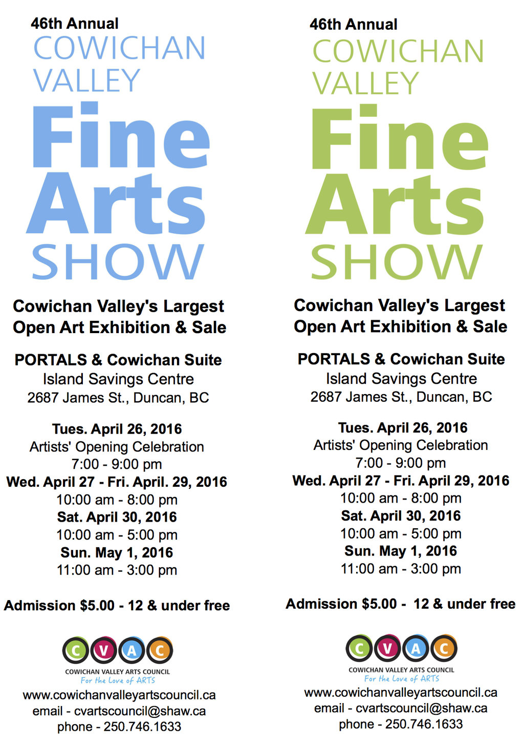 The 46th annual Cowichan Valley Fine Arts Show takes place April 27 - May 1, 2016. This is Cowichan Valley's Largest Open Art Exhibition and Sale. Up to 150 pieces of original local artwork will be featured. Admission is $5 at the door, 12 and under are free. Located in PORTALS and the Cowichan Suite, Island Savings Centre, 2687 James St., Duncan. For more info call 250-746-1633 or visit www.cowichanvalleyartscouncil.ca