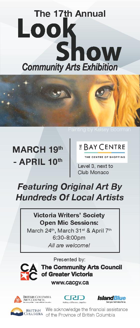 The 17th Annual LOOK Show Visual Arts Celebration is proudly sponsored by the Community Arts Council of Greater Victoria in partnership with The Bay Centre. The LOOK Show receives artwork from across the community and there is no jurying process to select the works. Experienced and emerging artist alike are welcome.