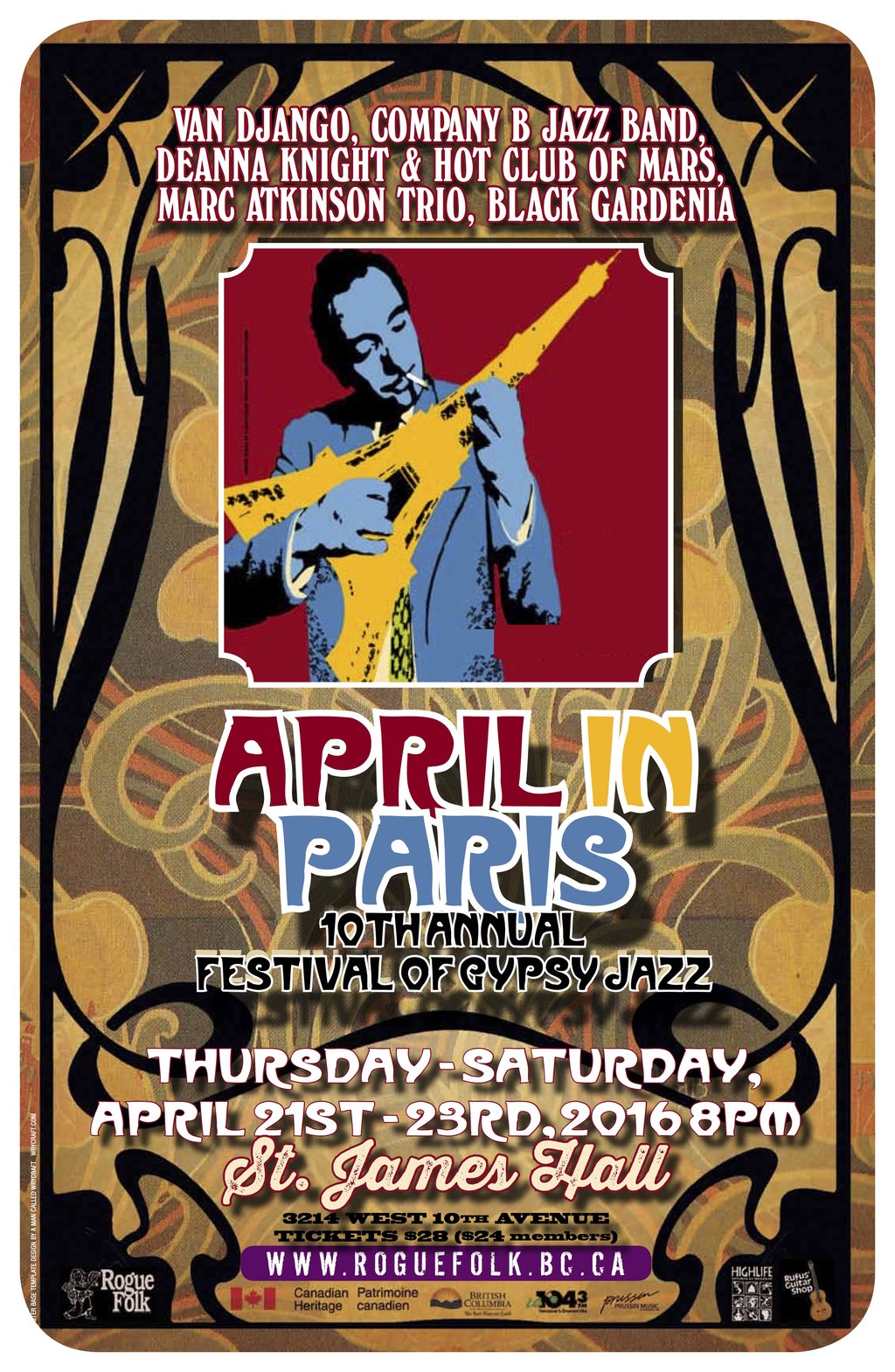 April in Paris: 10th Annual Gypsy Jazz Festival: Marc Atkinson Trio, Black Gardenia @ St. James Community Hall Apr 23 2016 - Feb 4th @ St. James Community Hall