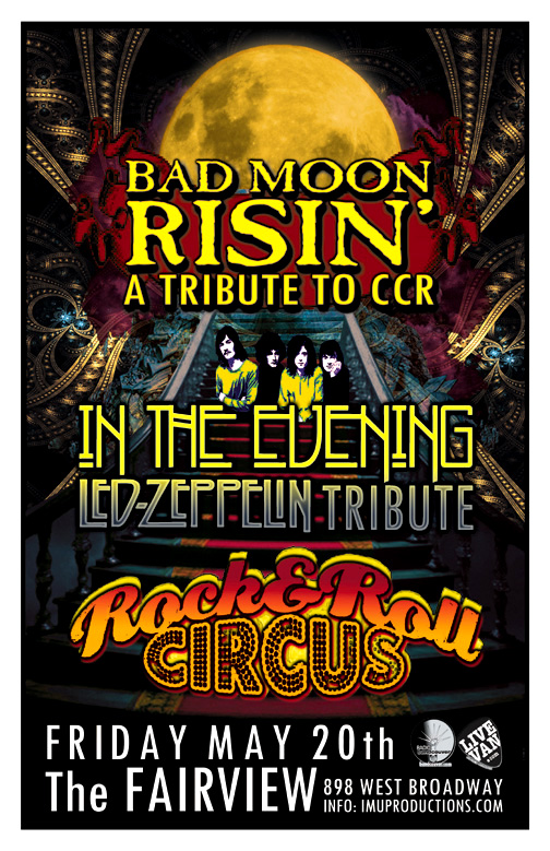 . Friday, May 20th IMU presents BAD MOON RISIN' CCR Tribute w/ IN THE EVENING Led Zeppelin Tribute & ROCK'N'ROLL CIRCUS (70's covers w/ a modern spin) @ The Fairview, 898 West Broadway . Show 9:30pm / $10 cover