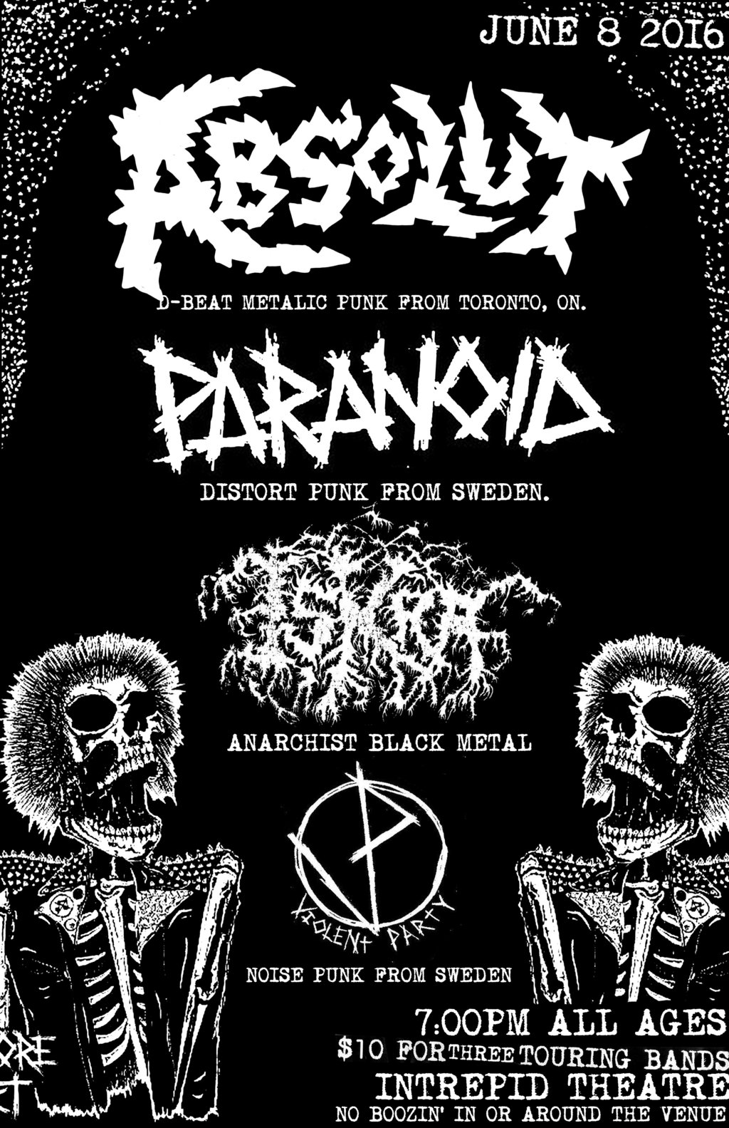 ALL AGES PUNK METAL CHAOS: Absolut  (Toronto, On), Paranoid  (Froson, Sweden), ISKRA, Violent Party  (Portland, Or) @ Intrepid Theatre Jun 8 2016 - Feb 4th @ Intrepid Theatre