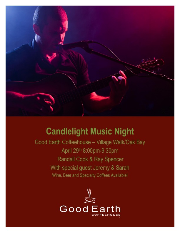 Candle Light Friday Night: Ray Spencer, Randall Cook, Jeremey & Sarah @ Good Earth Coffeehouse Oak Bay Apr 29 2016 - Feb 8th @ Good Earth Coffeehouse Oak Bay