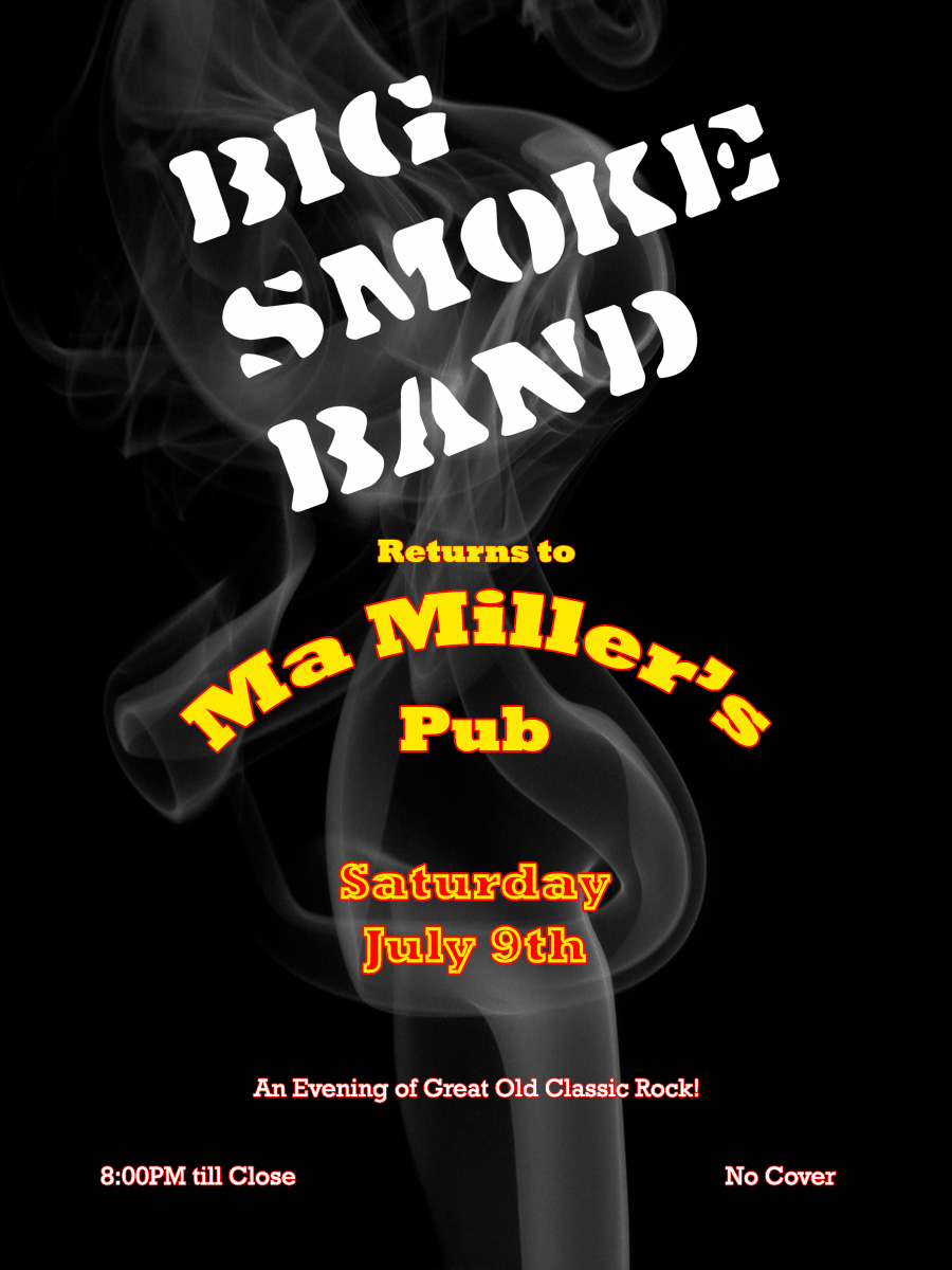 We are so pleased to announce Big Smoke will be returning to Ma Millers Pub July 9th 8:00PM for another night of good old Classic Rock! If you have not been there since it reopened....You must go!!! Great staff, Atmosphere, Food, and Entertainment!!! See you there!