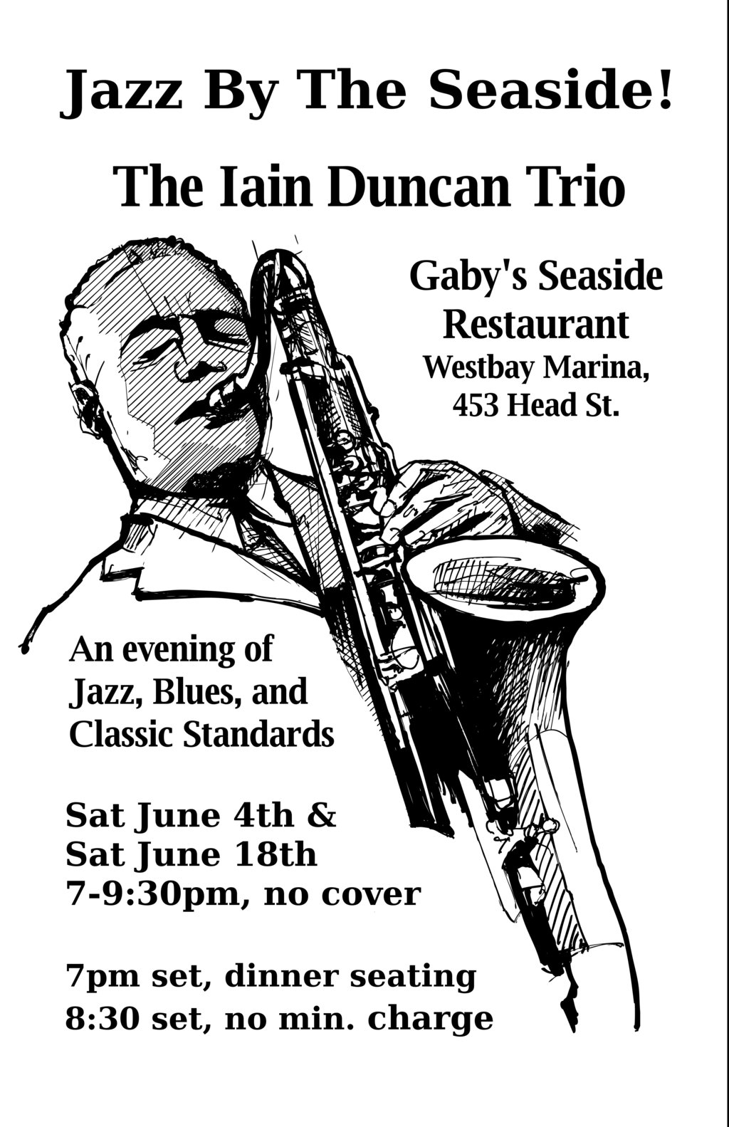 We'll be bringing more jazz to Gaby's Seaside Restaurant this weekend, hope you can join us! This time I'm joined by Jon Miller on drums and Trav Short on the bass. Standards, blues, bossa-novas, and more. No cover.