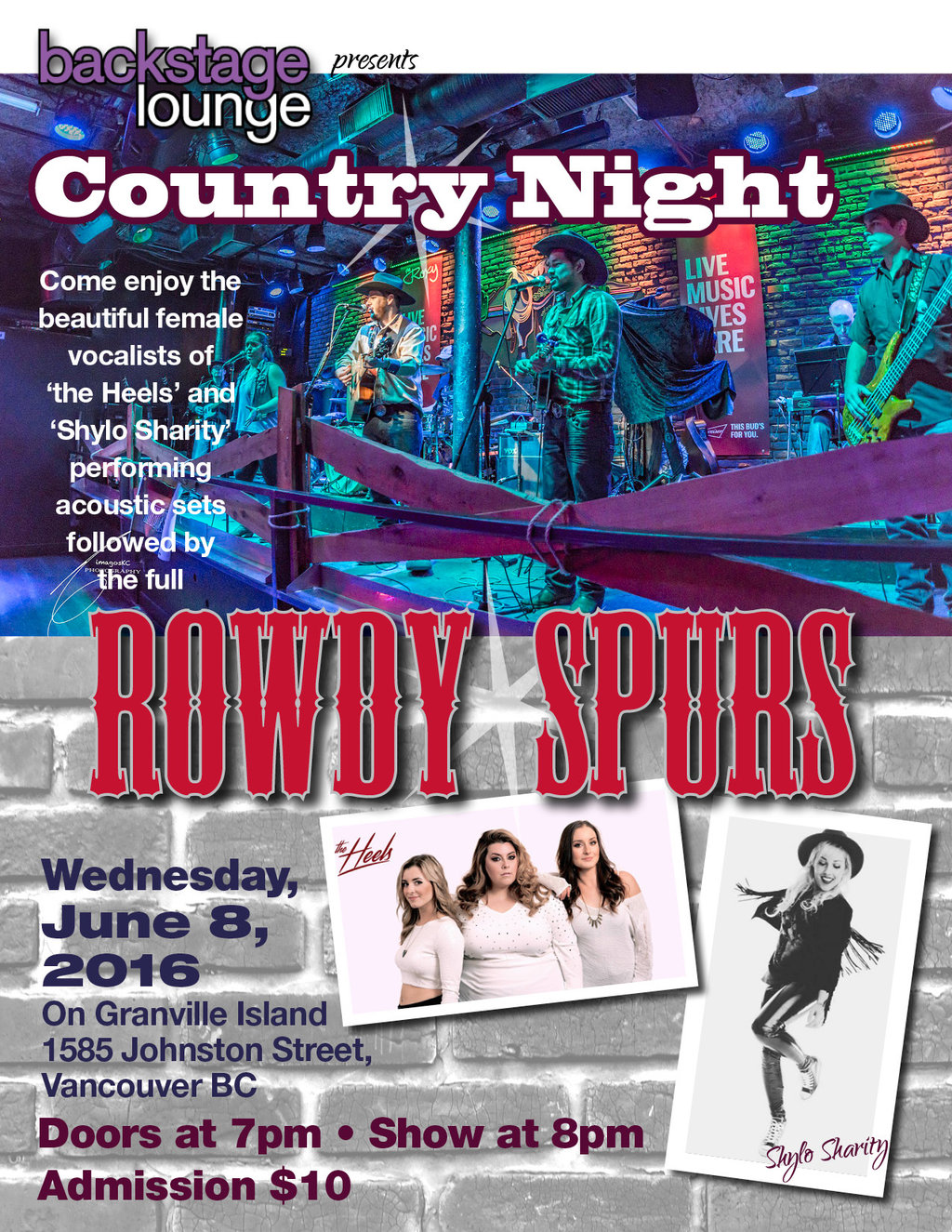 Rowdy Spurs, The Heels, and Shylo Sharity are hittin' the stage at the Backstage Lounge Wednesday June 8 at 7pm!! Come check out these amazing locally talented ladies preform their acoustic sets followed by a good old fashion Rowdy Spurs set. Located right downtown on Granville Island, it's sure to be a great night. $5.75 draft beer and $4.50 highballs!!