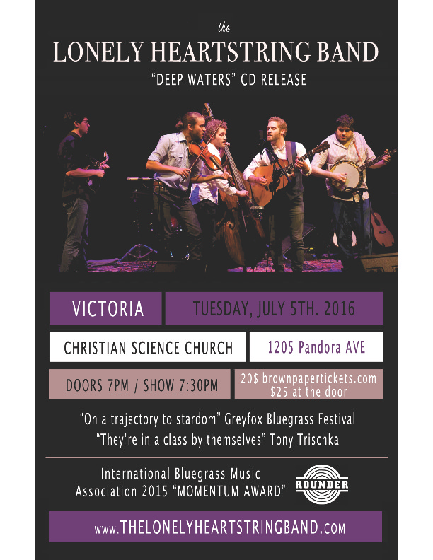 This concert features the exciting Boston-based band, Lonely Heartstring Band (fiddle, mandolin, guitar, bass and banjo). They come with a brand new Rounder Records CD, DEEP WATERS and a Momentum Award from the International Bluegrass Music Association for the "best new band." T
