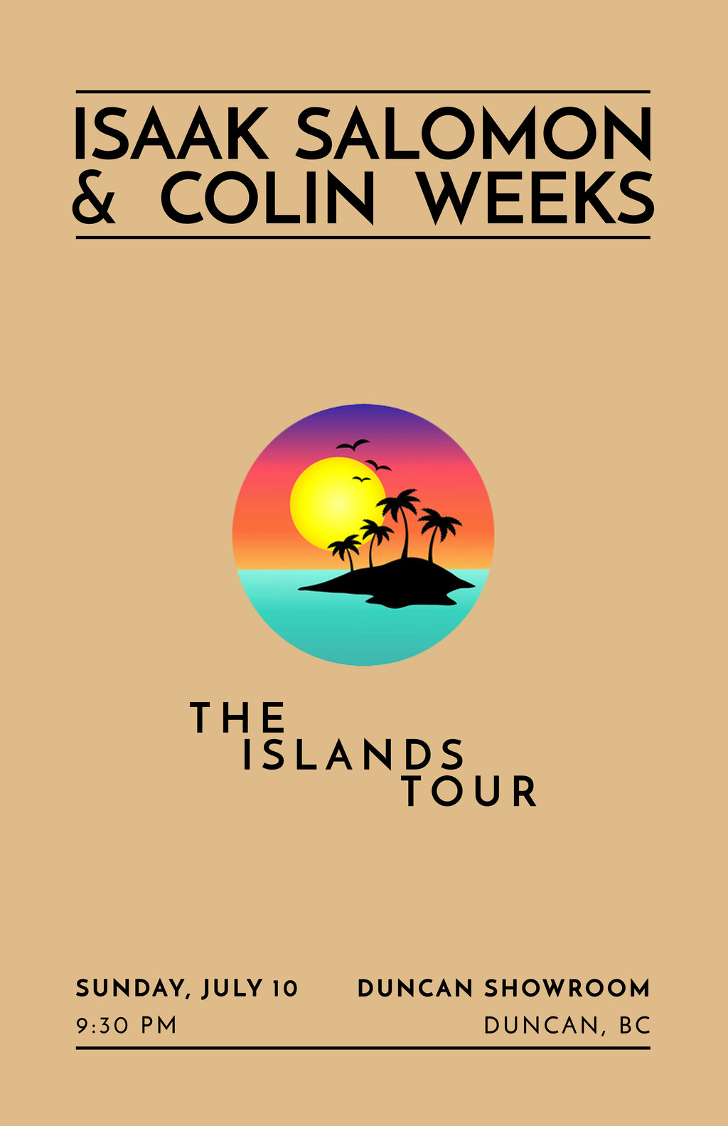 Vancouver musicians Isaak Salomon & Colin Weeks are heading out on The Islands Tour this July, and are making a stop at the Duncan Showroom. Join them on Sunday, July 10 at 9:30 PM to enjoy their sunny mix of folk/pop, western & island music.