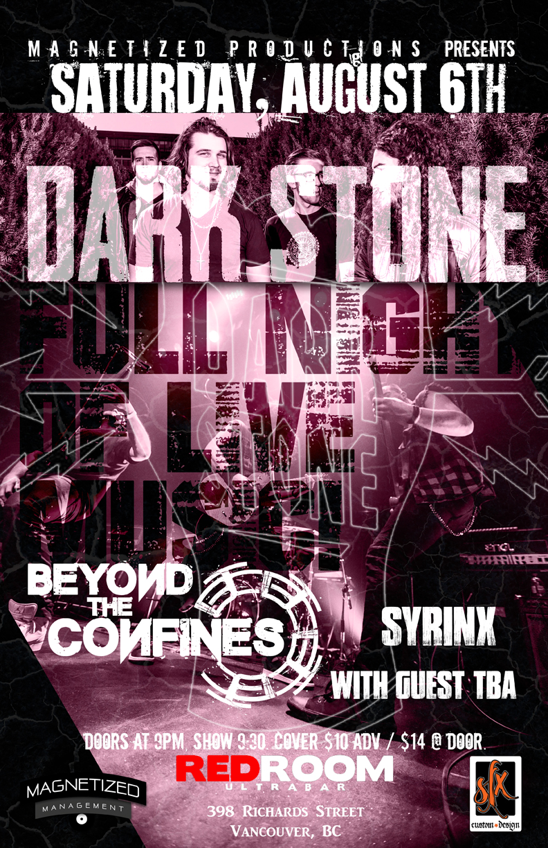 Magnetized Productions Presents: Dark Stone / Beyond The Confines / Syrinx and Guest TBA. Saturday, August 6th at Red Room Ultra Bar, 398 Richards Street, Vancouver, BC. Doors at 9pm, Show 9:30. Cover $10 Adv / $14 @ Door.
