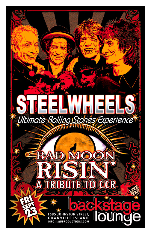 . Friday, September 23rd IMU presents STEEL WHEELS Ultimate Rolling Stones Experience w/ w/ BAD MOON RISIN' CCR Tribute @ The Backstage Lounge, 1585 Johnston Street. Show 9:30pm / $10 cover