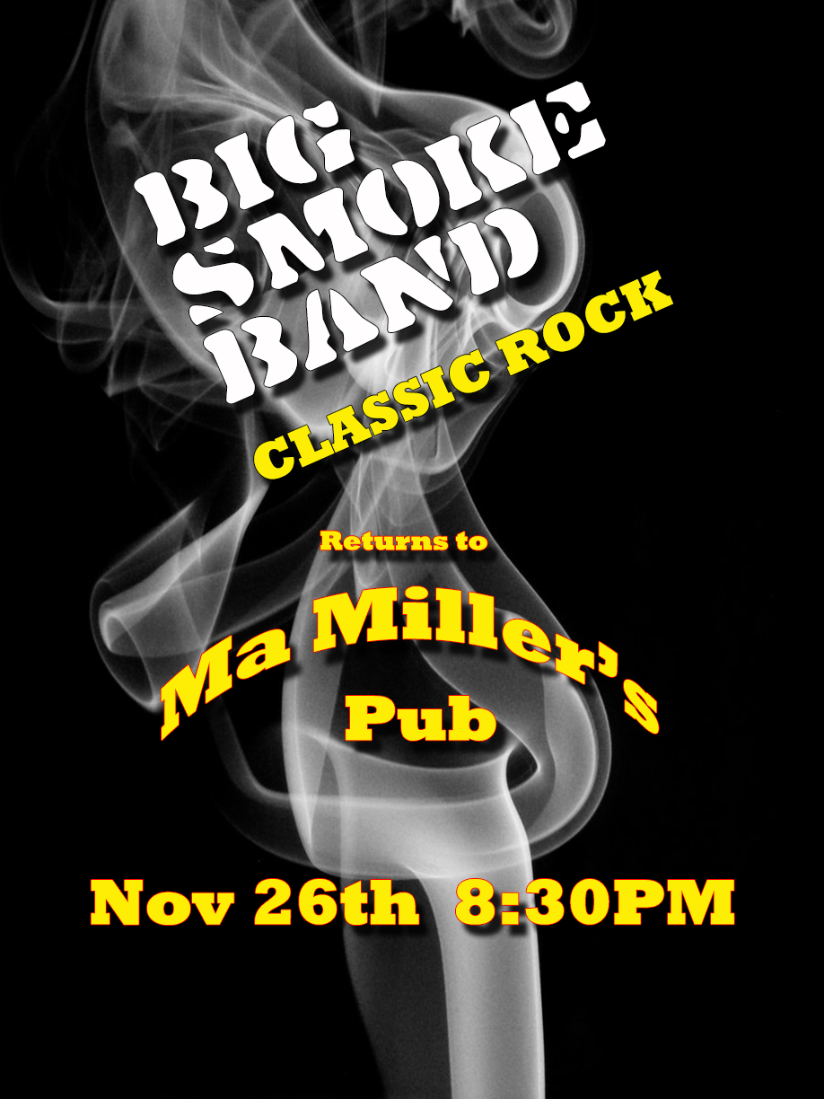 Super Pleased to announce Big Smoke will be returning to Ma Millers Pub on Nov 26th! We love Ma's and hope you come out and join us in another eve of Kick Ass Classic Rock! We have a bunch of new tunes for you too!!! See you then!