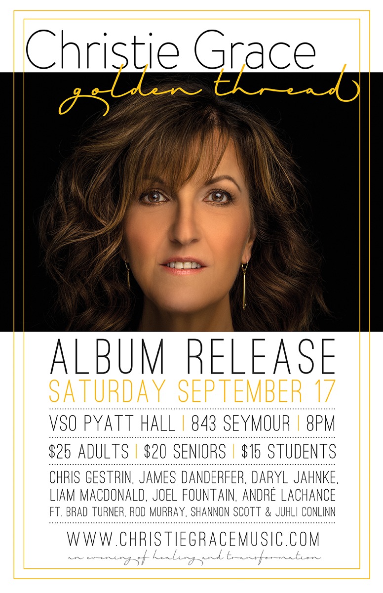 This highly anticipated Album Release concert features an all-star cast that includes Vancouvers musicians Chris Gestrin (also the Musical Director) along with James Danderfer, Brad Turner, Liam Macdonald, André Lachance, Rod Murray, Joel Fountain, Daryl Jahnke, Shannon Scott & Juhli Conlinn. Come celebrate the magic of veteran singer/songwriter Christie Graces' third studio album, Golden Thread, with this special concert at the Vancouver Symphony Orchestra's Pyatt Hall.