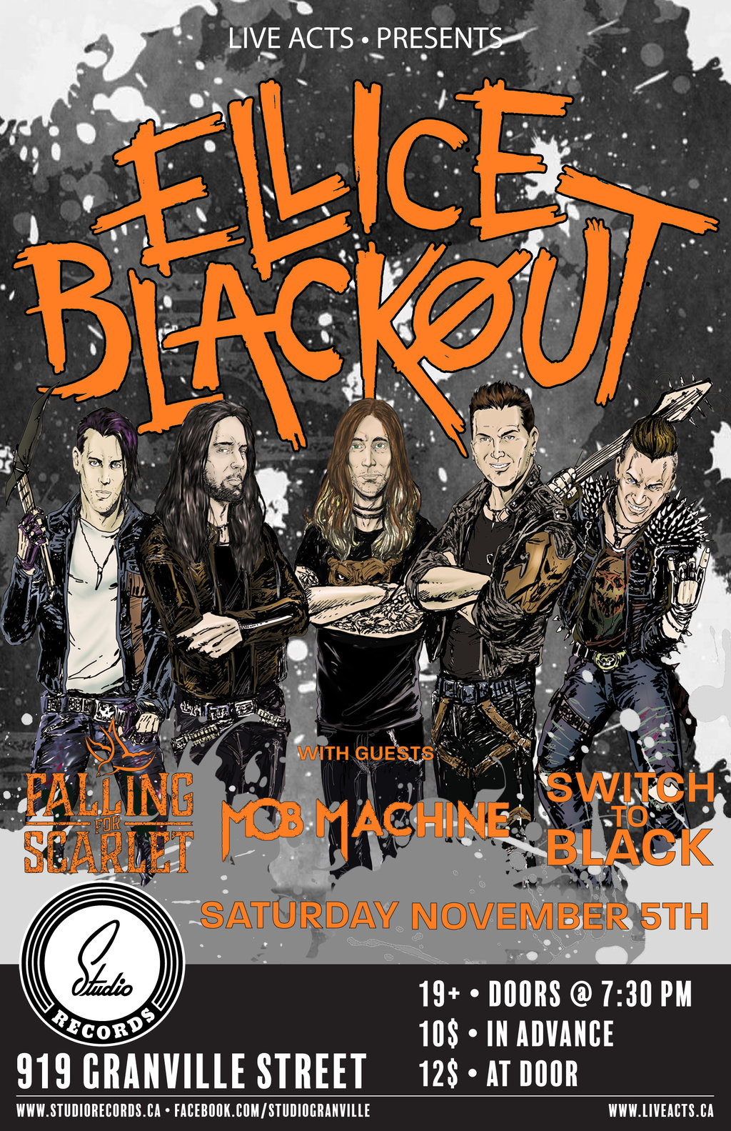 Live Acts Canada Presents Ellice Blackout with special guests Falling For Scarlet, Mob Machine and Switch To Black, Saturday November 5th at Studio Records.