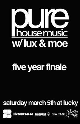 The PURE House Music with Lux n' Mo' Five Year Anniversay/Finale Party. All good things must come to an end... so come down to bid farewell to Victoria's longest-running House Music Weekly.