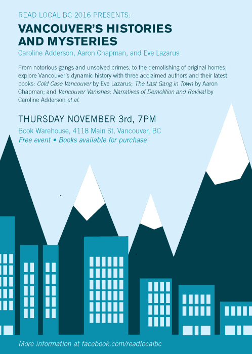 From notorious gangs and unsolved crimes, to the demolishing of original homes, explore Vancouver’s dynamic history with three acclaimed authors and their latest books: Cold Case Vancouver by Eve Lazarus; The Last Gang in Town by Aaron Chapman; and Vancouver Vanishes: Narratives of Demolition and Revival by Caroline Adderson et al.
