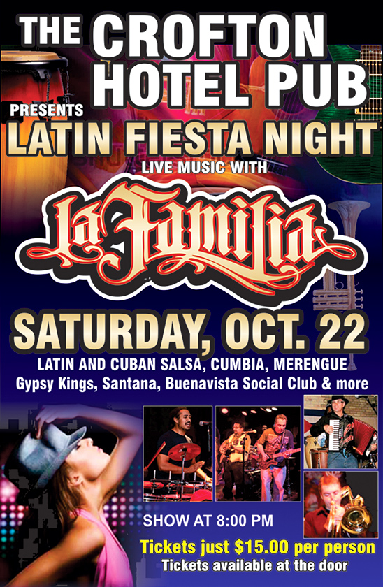 La Familia, 8 piece fiesta band brings on the Latin Heat. Bring your dancing shoes and dance to salsa, cumbia merengue with songs from the Gypsy Kings, Santana, Buenavista Social Club, Carlos Vives, Fabuloso Cadillacs and much more ! Tickets $15. Show at 8:00 pm Reservations recommended call (250) 324-2245