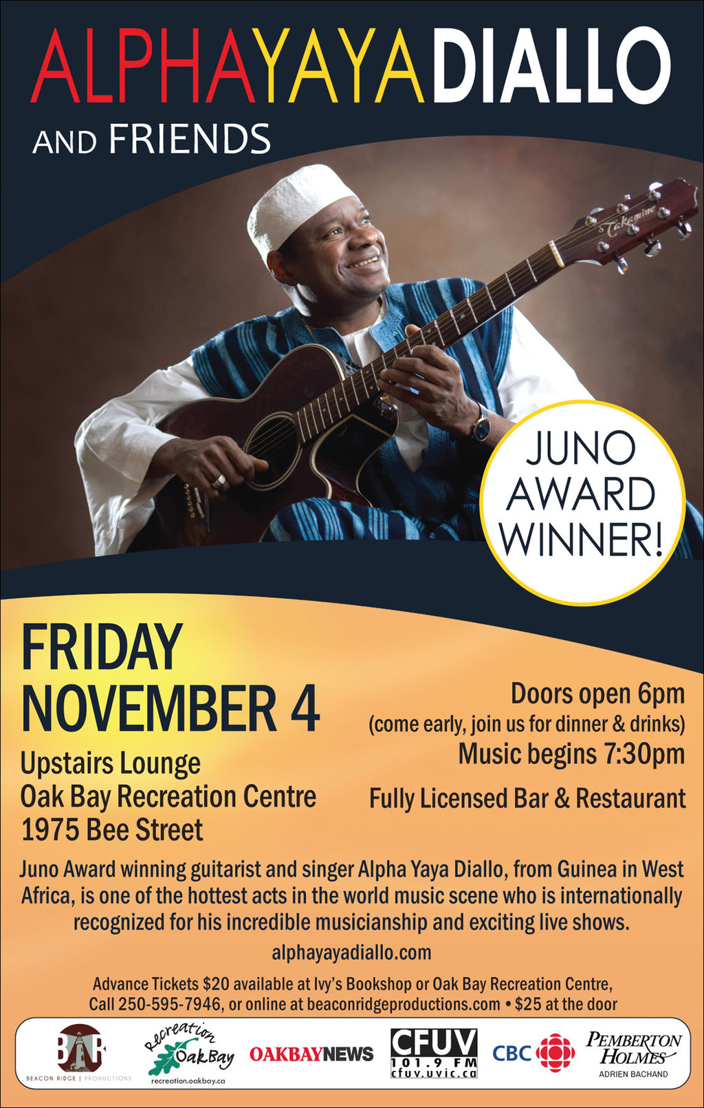 JUNO Award winning guitarist and singer Alpha Yaya Diallo, from Guinea in West Africa, is one of the hottest acts on the current world music scene. Now based in Vancouver, Canada, he’s earned a matchless reputation internationally for the excellence of his musicianship and the excitement of his live shows.