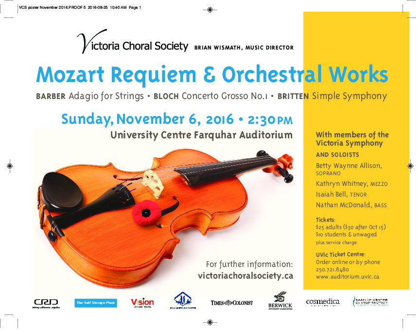 The Victoria Choral Society, under the baton of Brian Wismath, present Mozart’s Requiem in D Minor and orchestral works by Barber, Bloch and Britten, accompanied by members of the Victoria Symphony