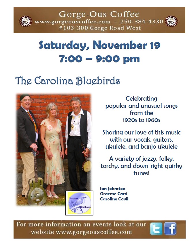 The Carolina Bluebirds enjoy sharing their love of cheerful and moving songs from the early- to mid-1900's, and introducing audiences to rarely-heard gems that were popular in their time. Caroline Covil (vocals) is joined by Graeme Card (guitar, vocals and occasional kazoo) and Ian Johnston (guitar, ukulele, banjo ukulele and vocals). Ian and Graeme are long-time musicians in Victoria: you may have heard Ian with bands such as Rig-A-Jig, The Slowpokes and The Garden City Blue Blowers; and Graeme with The Jug Bandits, The Chattering Class, and Humphrey and the Dump Trucks. Caroline’s clear and sweet soprano vocals and warm delivery suit the music perfectly and balances the ragtime guitar picking.