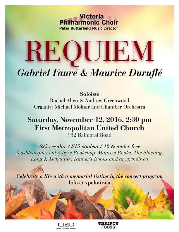 The Victoria Philharmonic Choir, conducted by Peter Butterfield, presents Requiem by Gabriel Fauré and Maurice Duruflé: Rachel Allen, Andrew Greenwood, Michael Molnar @ United Commons (First Metropolitan United Church) Nov 12 2016 - Feb 3rd @ United Commons (First Metropolitan United Church)